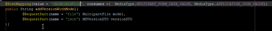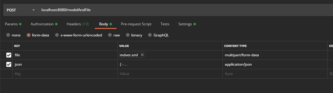 First way:如果要使用postman/javaScript框架->,则必须定义每个RequestPart的媒体类型(实际上不需要文件,文件将自动设置)。邮递员的例子: