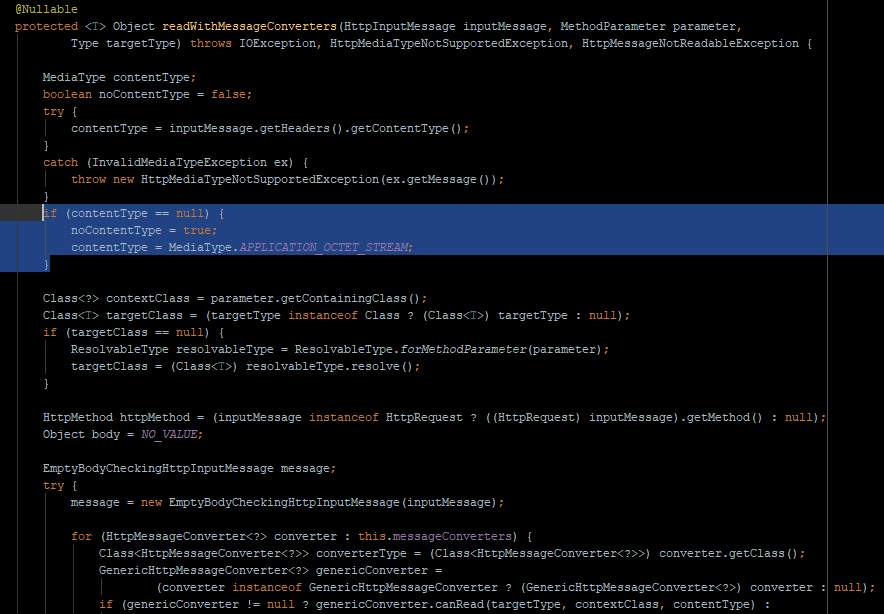 第二种方式:实现对八位流的维护,因为如果请求部分中没有内容类型标头,spring默认在AbstractMessageConverterMethodArgumentResolver.class中设置它。(我正在使用spring-boot-starter-parent 2.4.1 -> spring-webmvc 5.3.2)
