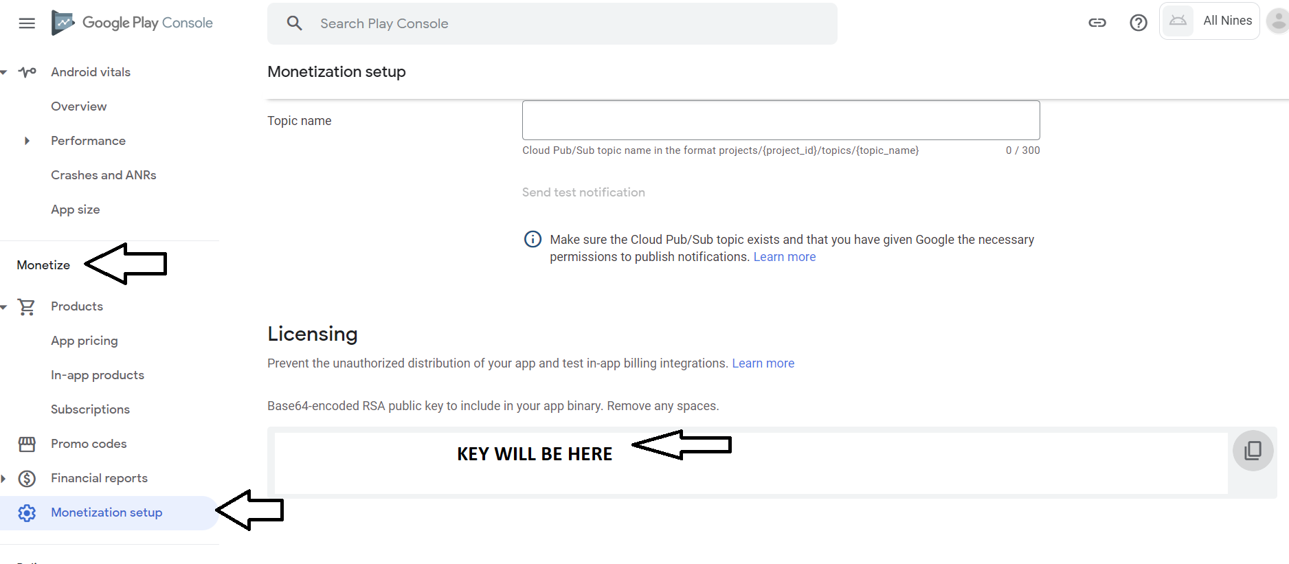 在游戏控制台中,选择你的应用程序。然后导航到左边的酒吧赚钱。在这种情况下,你会发现货币化的设置。你的许可证钥匙会在那里。