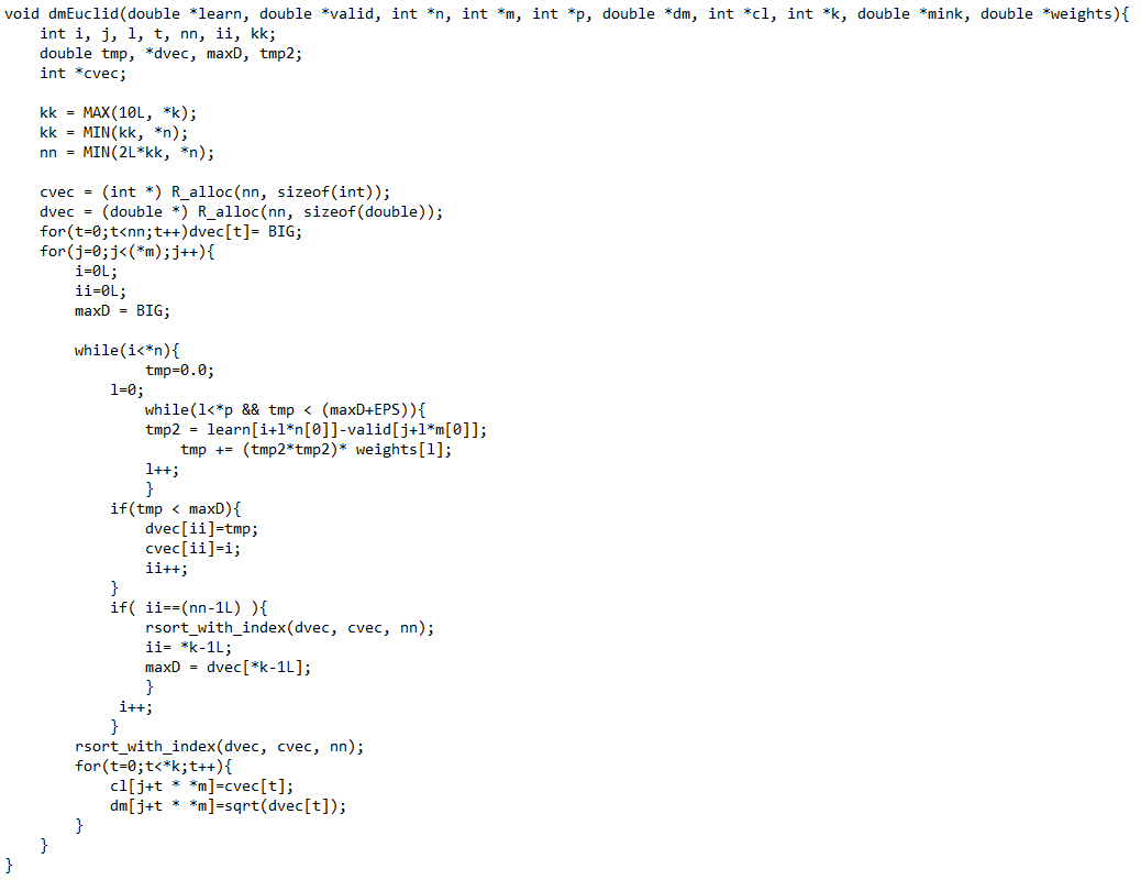 kknn调用编译后的C代码dmEuclid。为了获得它的源代码,我们遵循本指南,在R中编写了以下代码: