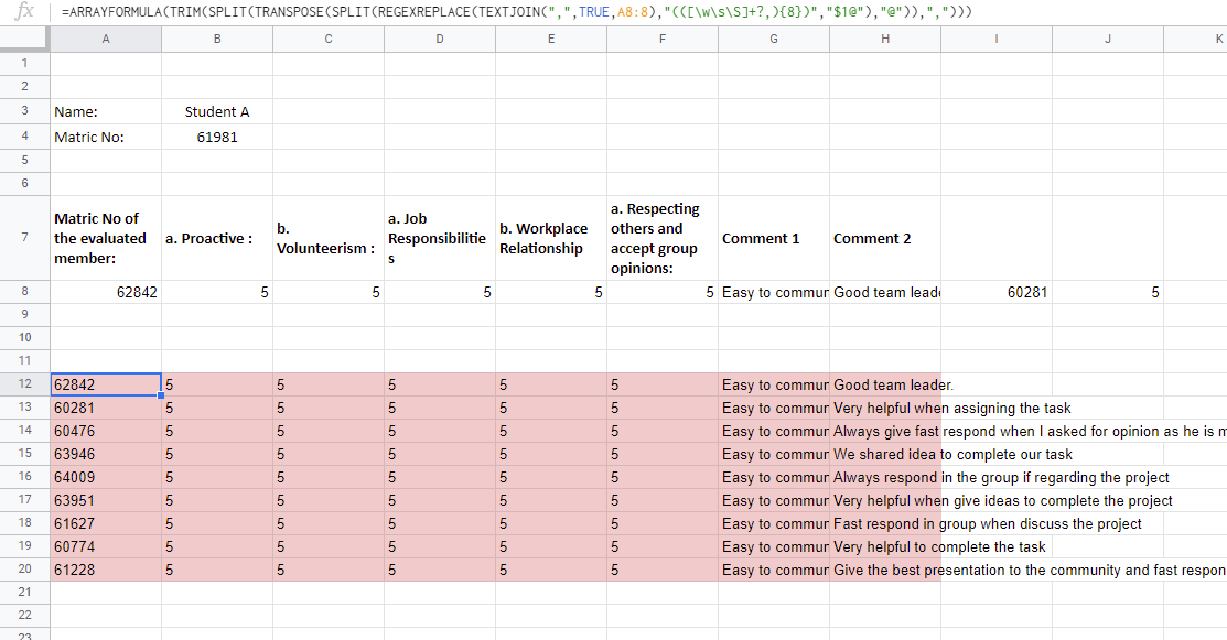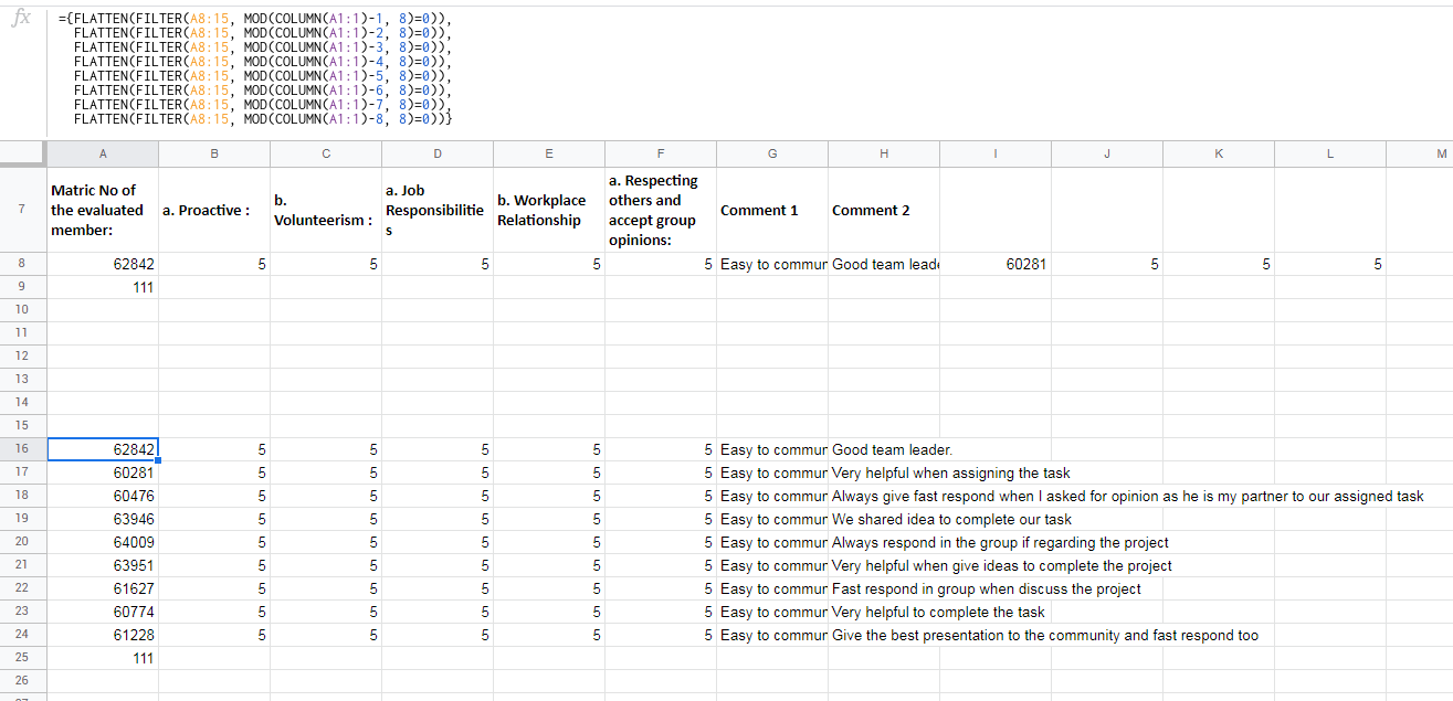 =ARRAYFORMULA(TRIM(SPLIT(TRANSPOSE(SPLIT(REGEXREPLACE(TEXTJOIN(",",TRUE,A8:8),"(([\w\s\S]+?,){8})","$1@"),"@")),",")))A8:8被用作范围。但是当您有几行时,请修改范围。并且,行被8列分开。因此,(([\w\s\S]+?,){8})被用作正则表达式。结果: