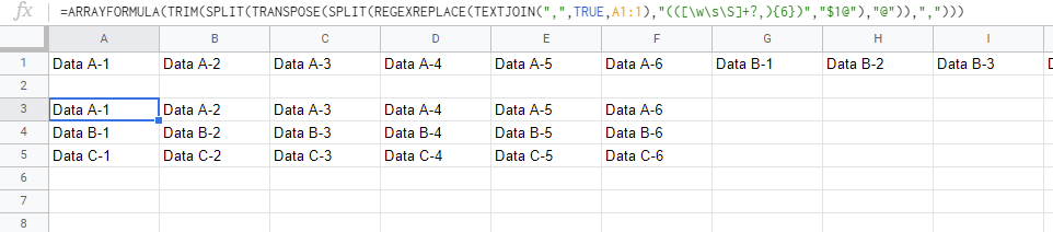 =ARRAYFORMULA(TRIM(SPLIT(TRANSPOSE(SPLIT(REGEXREPLACE(TEXTJOIN(",",TRUE,A1:1),"(([\w\s\S]+?,){6})","$1@"),"@")),",")))A1:1被用作范围。但是当您有几行时,请修改范围。行被6列分开。因此,(([\w\s\S]+?,){6})被用作正则表达式。TEXTJOIN忽略空单元格来连接所有单元格值。@将REGEXREPLACE放到6列的联合文本值中。@使用SPLIT拆分文本值。TRANSPOSE转置分裂值。,使用SPLIT拆分每一行。结果: