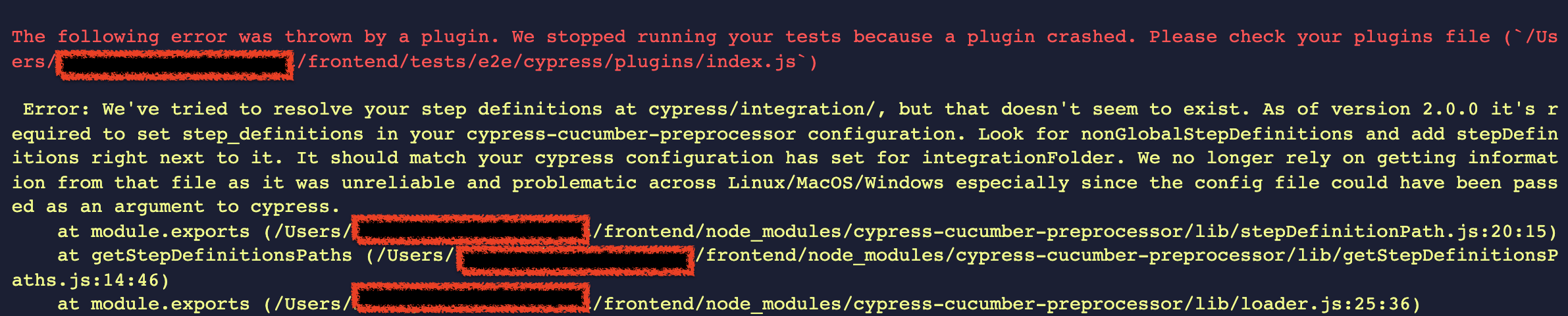这可能会有所帮助:在package.json中,将标志nonGlobalStepDefinitions设置为false,并定义目录测试来自:"stepDefinitions":"cypress/integration/“