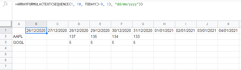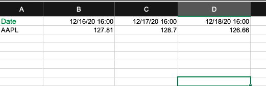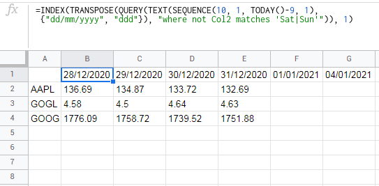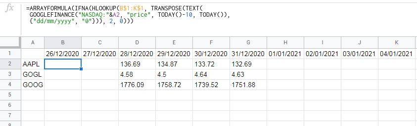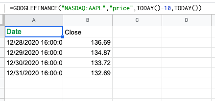 =GOOGLEFINANCE("NASDAQ:AAPL","price",TODAY()-10,TODAY())结果如下