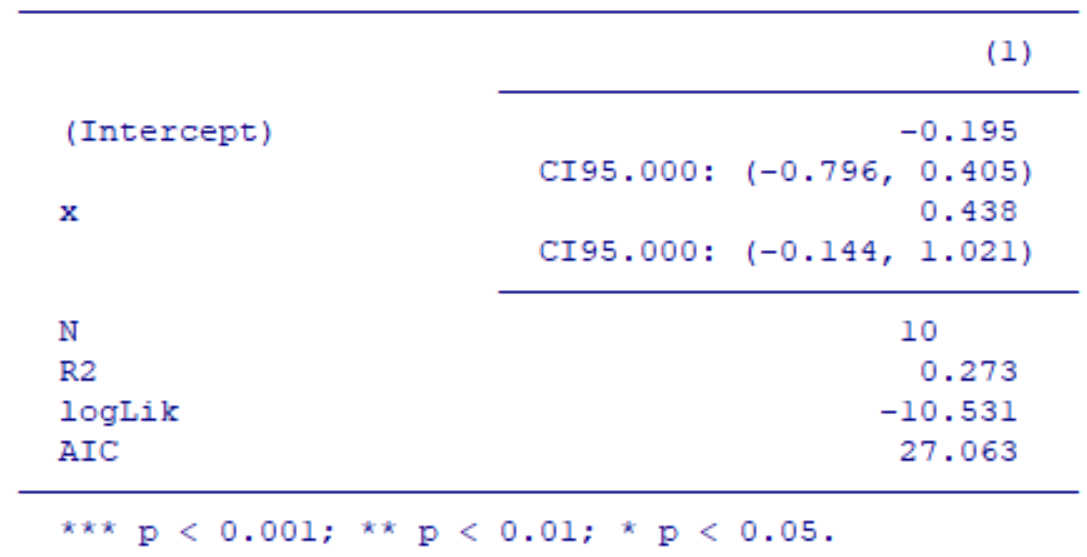 虽然不是最优的,但您也许可以将, number_format = c("%.3f", "%.3g", "%.3f", "%.3g")添加到huxreg调用中,以具体影响表中CI95行的格式设置(或者将输出保存为对象,然后修改定义这些行格式的属性元素,例如do attr(res, "number_format")[[13]] <- "%.3g"等)。除此之外,我只能考虑以某种方式修改底层的glue转换器,该转换器转换整个字符串,并使所有数值元素都具有相同的格式。
