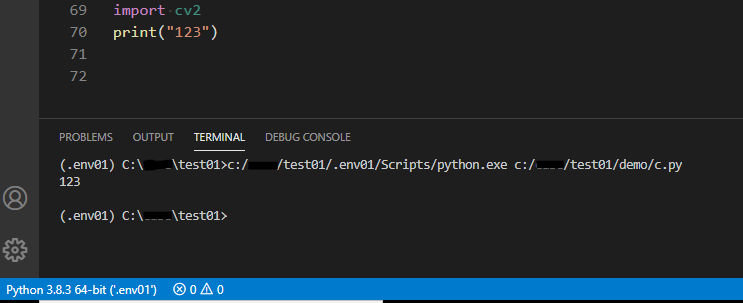 请使用VSCode终端中的“VSCode”检查模块"cv“的安装位置,然后单击VSCode左下角的VSCode环境,并将其更改为安装模块"cv”的环境。