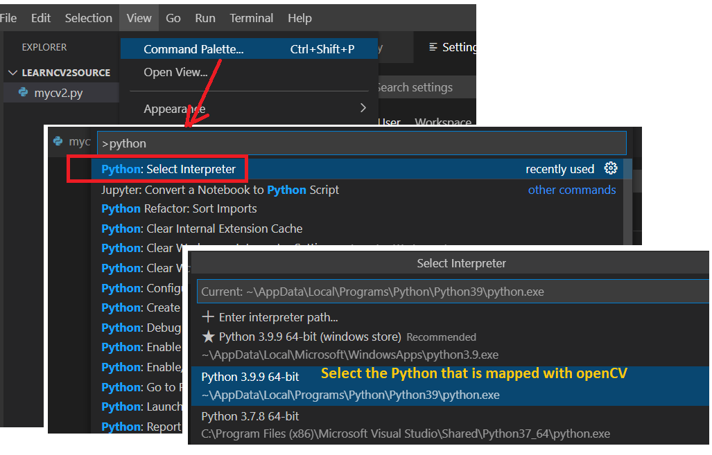 print(sys.executable)如果python与安装的openCV不同,则需要通过以下图像进行更改