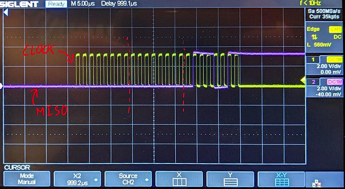 在图像中,我正在探测SCLK和MISO线。显然,MISO行上的最后8位是0b01110011,这是预期的数据。我写的驱动程序没有反映这一点,它总是从SPI DR寄存器中读取0。由于SPI外围设备(可能遗漏了什么),我在调试模式下运行代码时遇到问题,无法使用printf输出值(不能访问UART接口)。我希望能有一些关于什么问题的想法。