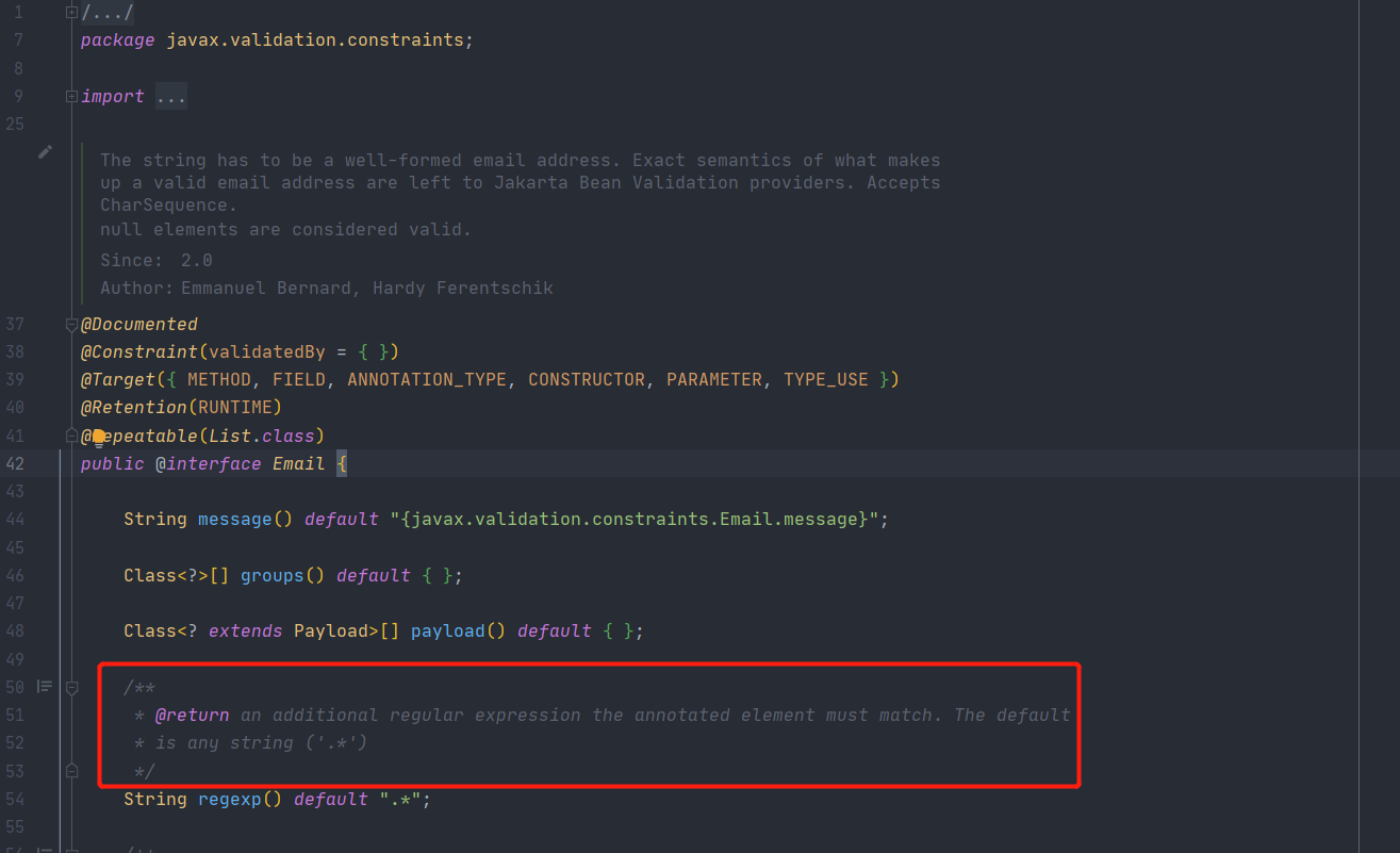 javax.validation.constraints.Email注释依赖于Jakarta Bean Validation providers进行验证。Hibernate Validator是唯一的遵从性验证器。默认情况下,hibernate vaildator将电子邮件与regex .*匹配,除非您自己提供regex。Hibernate电子邮件验证器源代码是这里。