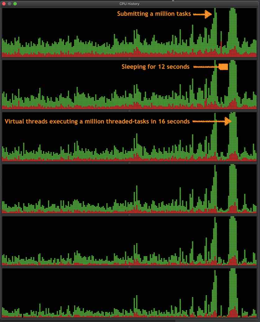 有关更多信息,请参见甲骨文织机项目的Ron最近(2020年末)的任何一次会谈,以及他在2020-05年度的论文https://cr.openjdk.java.net/%7Erpressler/loom/loom/sol1_part1.html?source=techstories.org。这种快速交换阻塞的虚拟线程的行为非常有效,以至于CPU可以一直处于忙碌状态。我们可以在Activity应用程序中确认这种效果。下面是活动监视器的屏幕截图,它使用虚拟线程运行百万任务。注意CPU内核在完成12秒的午睡后,实际上是100%繁忙的。