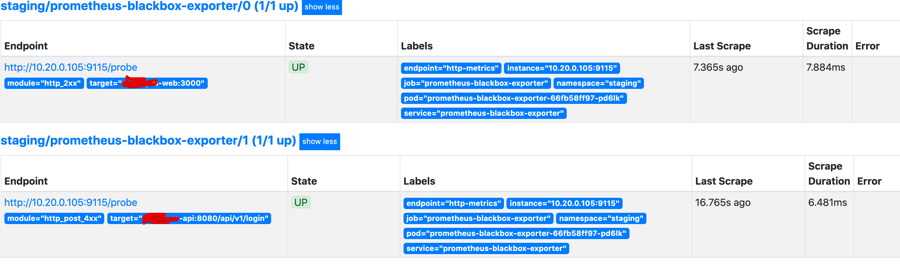 probe_success{endpoint="http-metrics",instance="10.20.0.105:9115",job="prometheus-blackbox-exporter",namespace="staging",pod="prometheus-blackbox-exporter-66fb58ff97-pd6lk",service="prometheus-blackbox-exporter"}