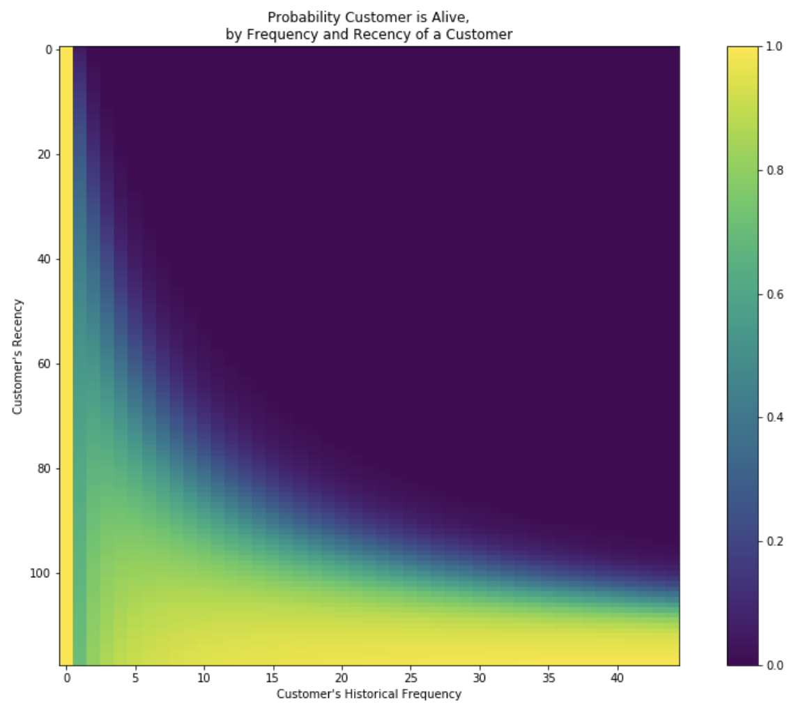 我正在实施BG/NBD模型,并绘制了存活矩阵的概率图如下: