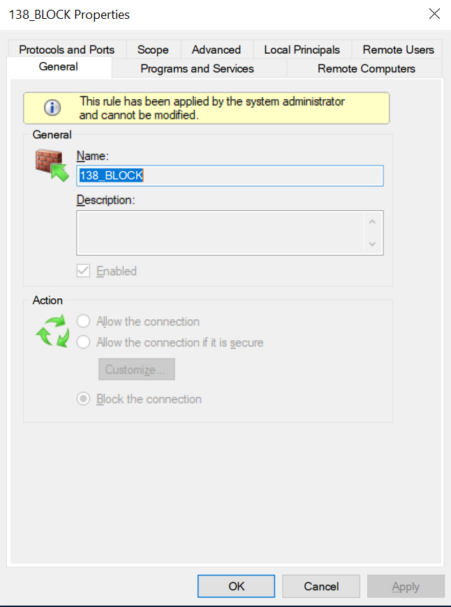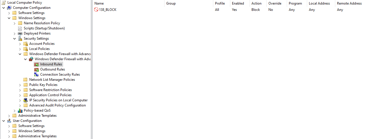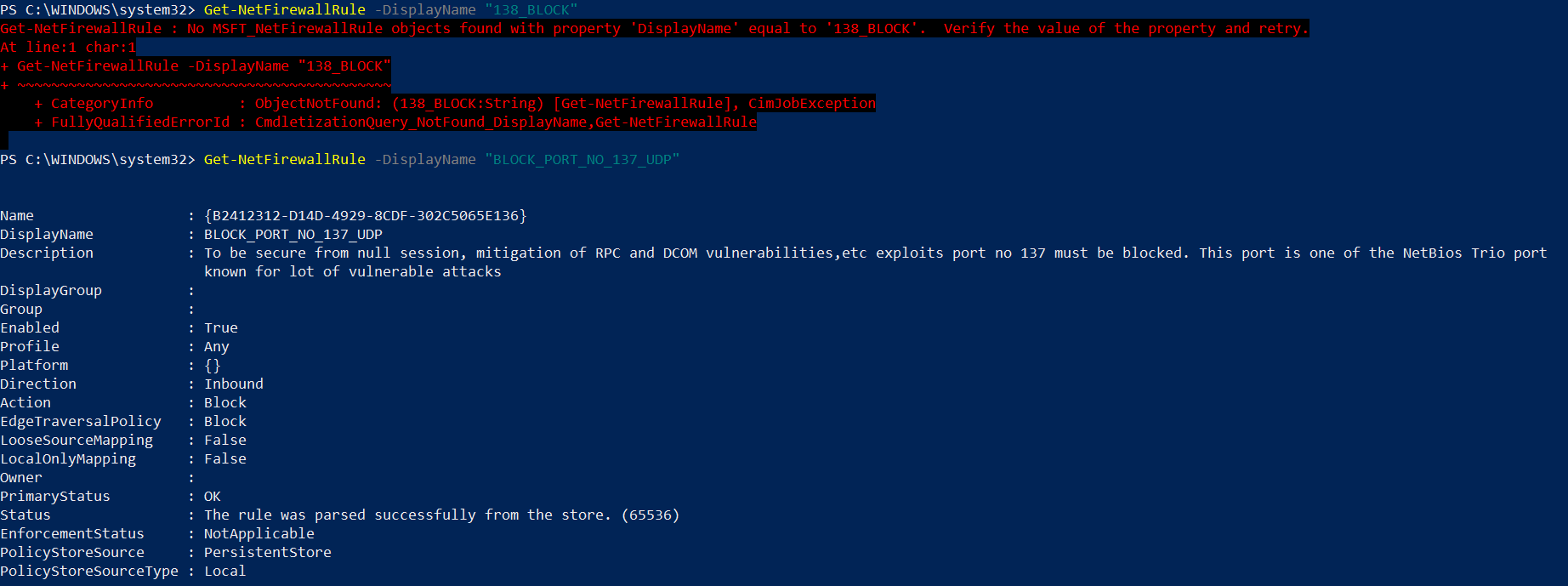 我创建了一个防火墙规则,使用本地组策略编辑器(图1和图2)阻止入站端口138。当我运行 get -NetFirewallRule "" powershell命令时,我无法获得规则细节(图3)。但是,当我试图查询使用windows防火墙控制台创建的规则时,它工作正常。