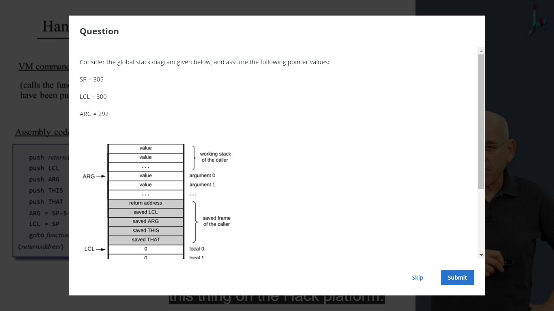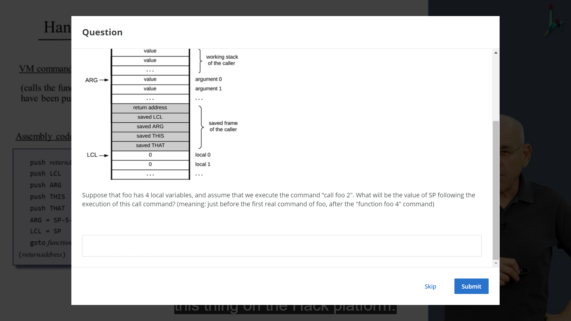 call foo 2:这条指令告诉vm调用带有2个参数(应该在调用之前推到堆栈的顶部)的foo。调用任何函数都意味着您应该执行以下步骤:推堆栈顶部的返回地址(SP++),然后推送LCL、ARG、THIS、that ( SP+4)。此时SP应该等于310.