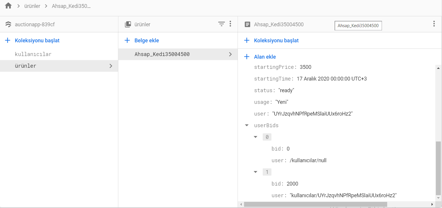我在云火药库中有两个集合,希望通过我的产品“userBids”中的一个字段来使用这两个集合,我正在使用文档引用: