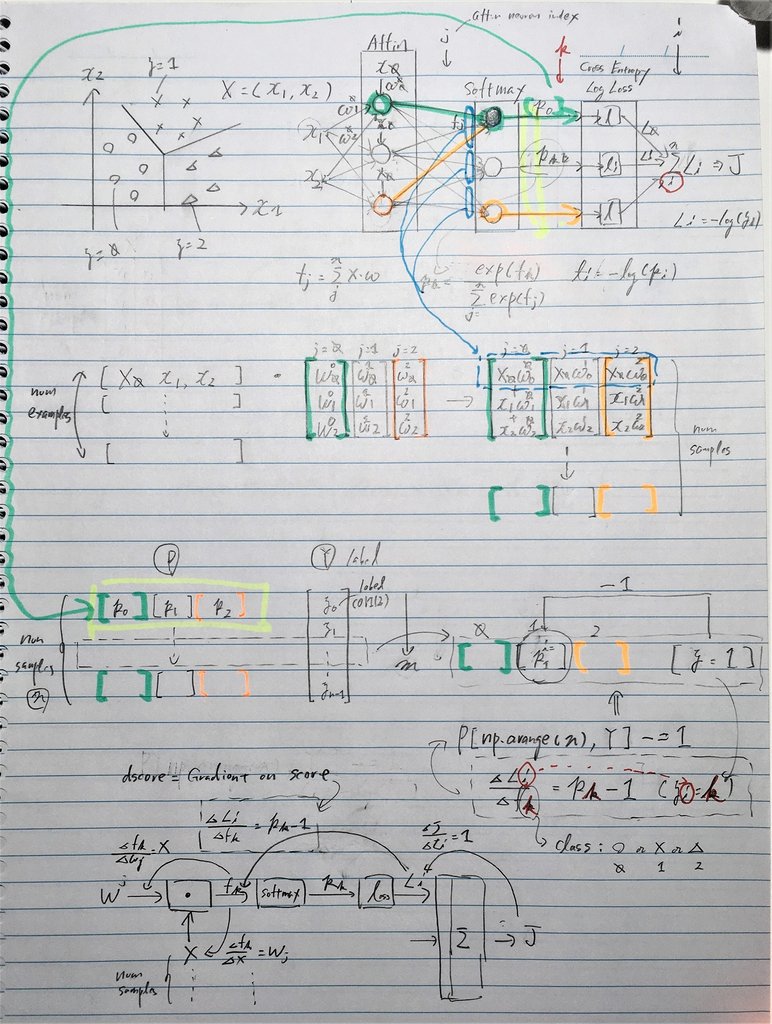 CS231 用反向传播法计算解析梯度首先实现了一种软件最大分类器,其梯度从(softmax + log损失)除以批次大小(用于前向成本计算的数据数和训练中的反向传播)。