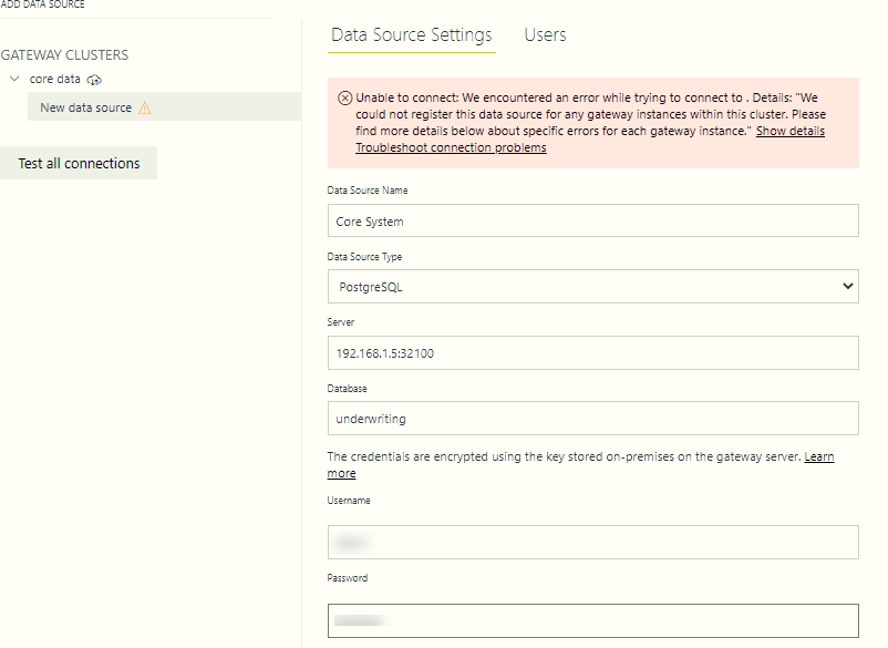 使用powerbi桌面,我可以轻松地连接服务器上的postgres数据库(192.168.1.5:32100),运行在端口和database_name上。但是,在前提网关上对PowerBI进行同样的操作,当在网关设置(网关集群)上添加数据源时,我无法连接。以下截图供参考。第一张图片是关于PowerBI桌面的,第二张是在网关设置上。是与端口有关吗?如果是的话,我可以在PowerBI桌面上连接,如果没有,是否有任何方法或我遗漏了什么。提前谢谢你的帮助。