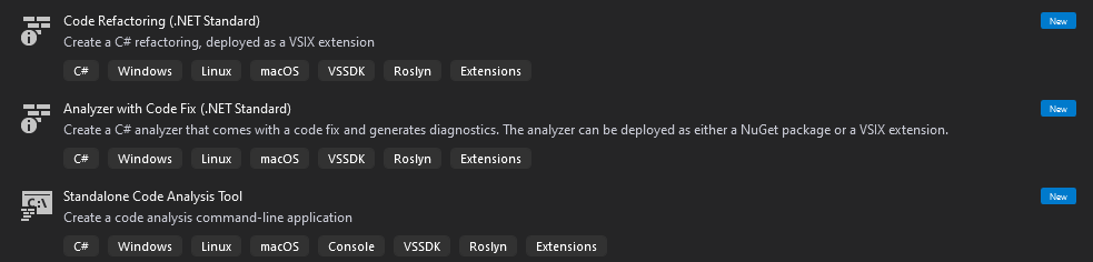 我想我应该深入编写一个自定义代码分析器,这样我就可以强制执行一条规则,并允许应用代码修复。在安装所需工作负载后打开VS时,我会看到以下可用模板: