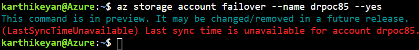 我们目前在帐户故障转移方面有一个持续的问题,它只能在帐户创建时间超过4小时后或帐户转换为(RA-)GRS之后的4小时内启动。例如,如果帐户是在下午1时创建的,那么LST应该是下午5点,以便故障转移工作。我们现在正在制定决议,但我还没有ETA。