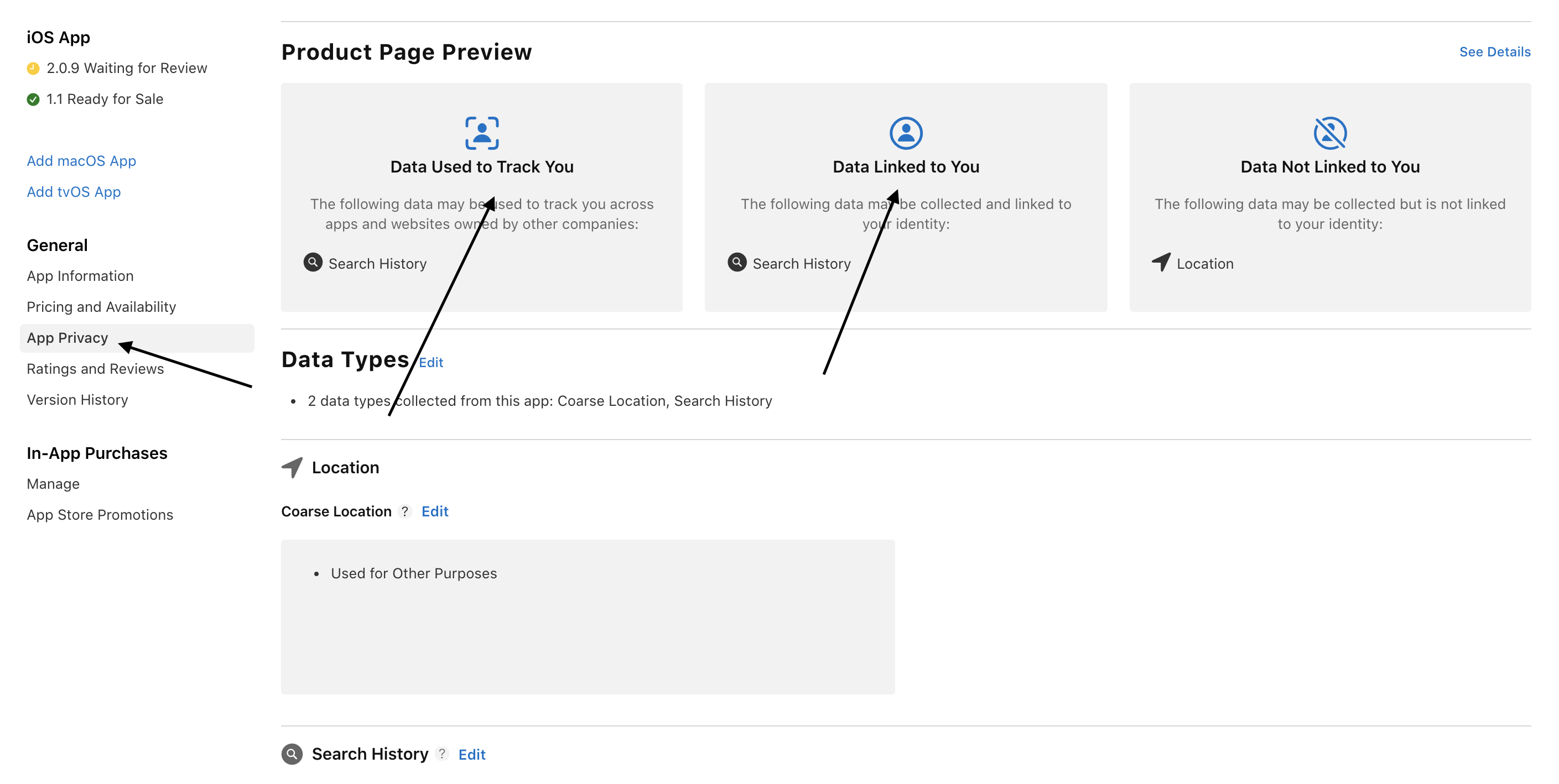 从昨天起,一项新的隐私政策将在提交应用程序时强制执行,以便通过app连接查看App。在昨天之前,我能够提交我的应用程序,但是今天,我得到了以下错误: