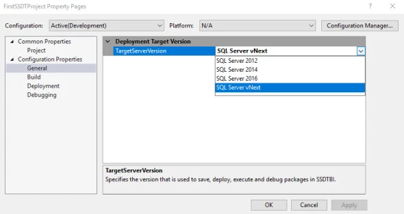 若要修复此问题,请在Visual中打开SSIS项目,选择“项目”并转到“菜单项目-属性”。然后在Properties窗口中,选择Configuration General和