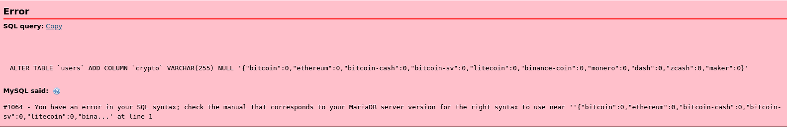 ALTER TABLE `users` ADD COLUMN `crypto` VARCHAR(255) NULL '{"bitcoin": 0, "ethereum": 0, "bitcoin-cash": 0, "bitcoin-sv": 0, "litecoin": 0, "binance-coin": 0, "monero": 0, "dash": 0, "zcash": 0, "maker": 0}';这是错误:您在SQL语法中有一个错误