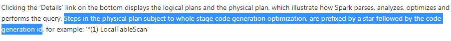 “物理计划中受整个阶段代码生成优化的步骤,以星号作为前缀,后面跟着代码生成id,例如:‘*(1)LocalTableScan’。”