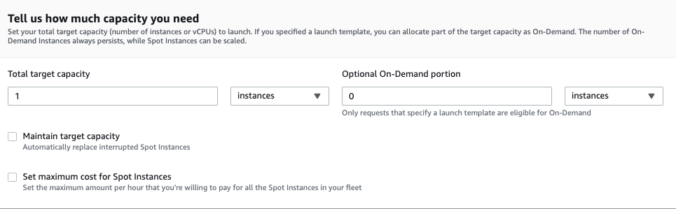 在AWS控制台中,我还可以使用启动模板启动spot机队,在那里我可以选择创建随需应变的实例,如下面的屏幕快照所示。