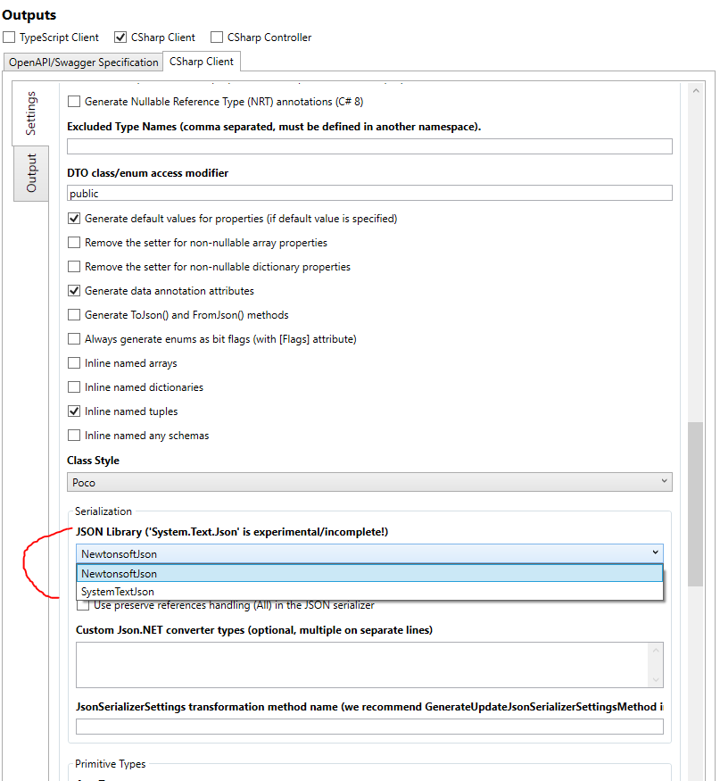 我有一个.NET的HttpClient的通用包装器,但是我想使用NSwagStudio的代码生成器来生成调用我的通用客户端而不是标准HttpClient的代码。我已经完成了大部分工作,但是有一部分我无法定制: DTO对象的代码。我知道它是从这里的File.liquid模板生成的: