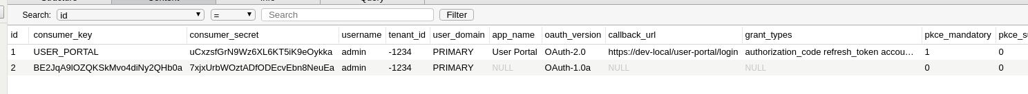 </soapenv:Envelope>但在db中,我发现了不同的键,oauth版本,callbackUrl和grant_types,如屏幕附件中所示。
