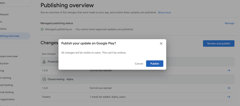 我的问题是,我现在不想发布生产版本,而是只想发布Alpha测试版本。但是,当我尝试按下“管理发布”部分中的“审查和发布”按钮时,它说: