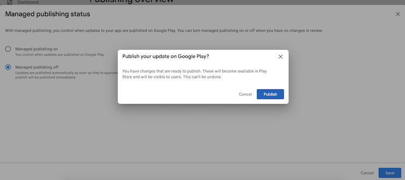 我还试图禁用谷歌支持人员建议的管理发布功能,但下面显示的弹出消息显示,即将发布的版本将立即发布,无法撤消。