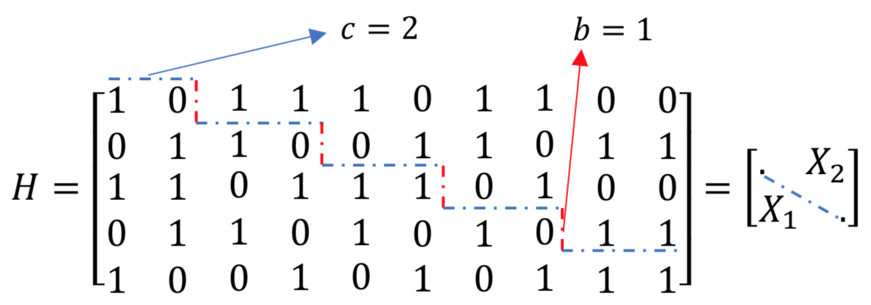 Diagonal切割图:矩阵H分为两部分。切割模式是这样的::We将c = 2单元移到右边几次c = 2单元向右移动,我们反复向下移动c - b = 1单元。我们得到: