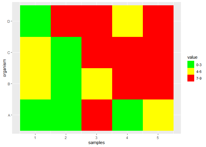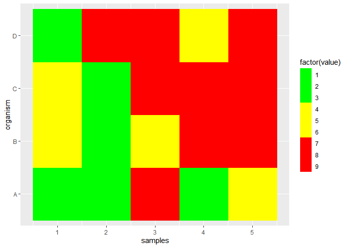 geom_raster(data = data, aes(x = samples, y = organism, fill = factor(value))) +