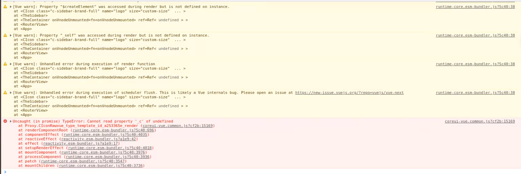 我需要升级项目从vue 2到vue3,我正在使用coreui模板。我升级了vue,vuex,vue-路由器。但是,当我为该项目服务时,它会在控制台中显示以下错误。