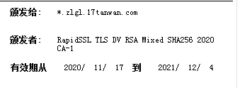 此证书由"RapidSSL TLS DV混合SHA256 2020 CA-1“的中间证书签署,该证书自2020-07-16年起有效。如果客户端已经有一段时间没有更新浏览器/操作系统,他们就没有这个中间证书,并将其报告为无效的证书颁发机构。