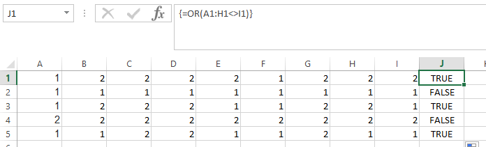 =OR(A1:H1<>I1)编辑后的数组公式通过按ctrl + shift + enter来确定。