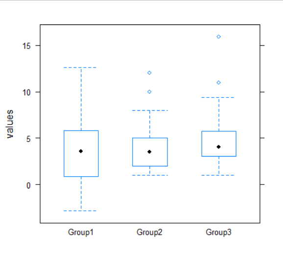 bwplot(values~ind, stack(list(Group1=xx1, Group2=xx2, Group3=xx3)), cex=0.7)