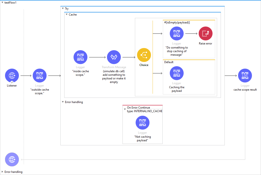 ERROR 2020-11-20 17:54:36,923 [[MuleRuntime].uber.03: cachingStrategy_null @302bcf75] [processor: testFlow1/processors/1/processors/0/processors/1; event: 594def80-2b2b-11eb-a1d0-a0d37a4d6fab] org.mule.runtime.core.internal.exception.OnErrorPropagateHandler: