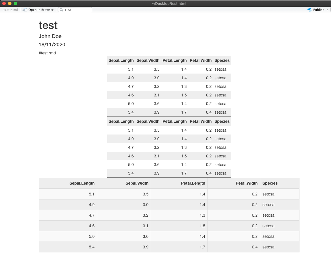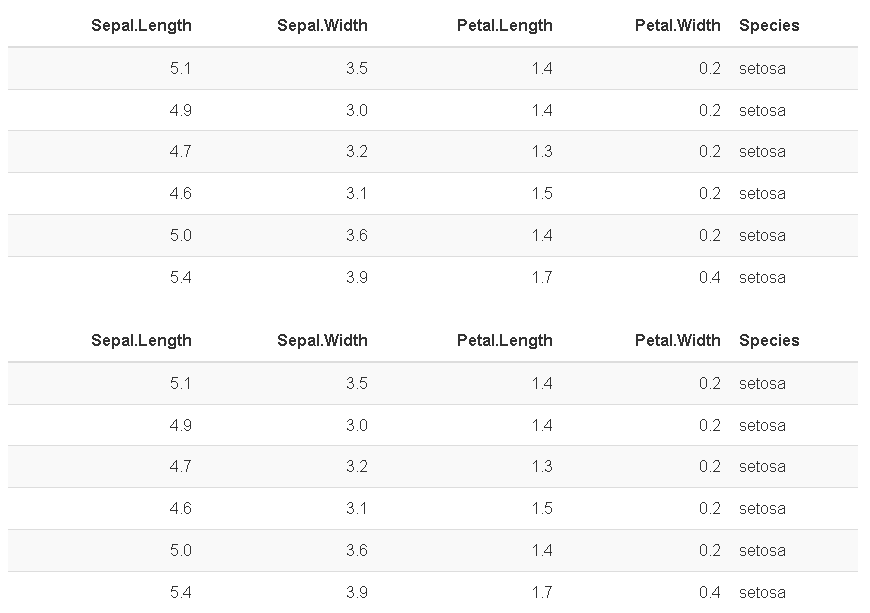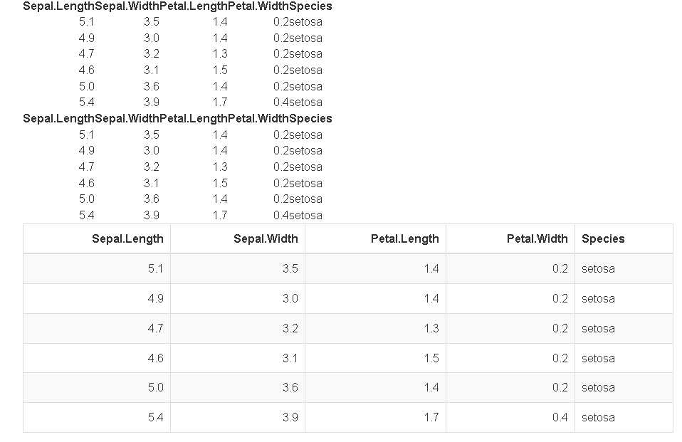 下面是它在html输出中的样子。前两个虹膜表没有很好的格式。我怎么才能让它们看起来像最后一张虹膜桌子?