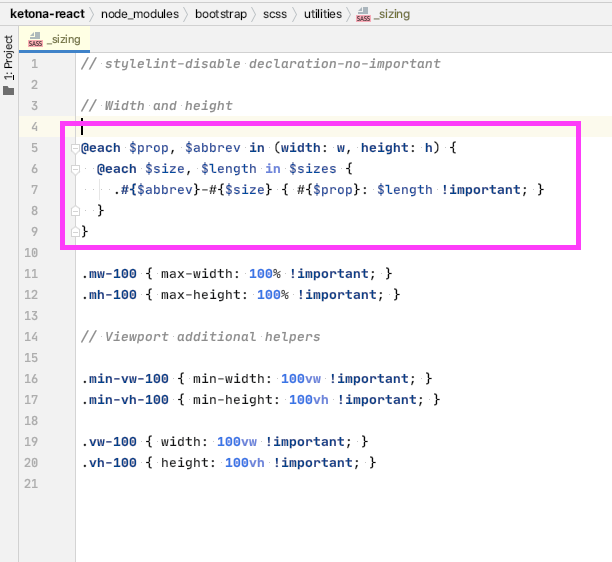 }在第一个宽度和高度是$prop,w和h是$abbrev。第二个循环迭代来自$size文件的$length和_variables.scss文件。