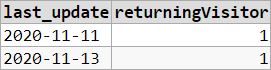 2020-11-13 19:53:16 | 1实际上,这两个日期的结果应该是1 returningVisitor。我试过用COUNT(DISTINCT ipAddress),结果还是不太好。