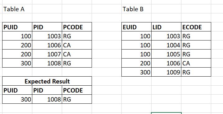 当A.PUID = B.EUID和A.PID <> B.LID时,如何从结果中排除PUID的所有记录