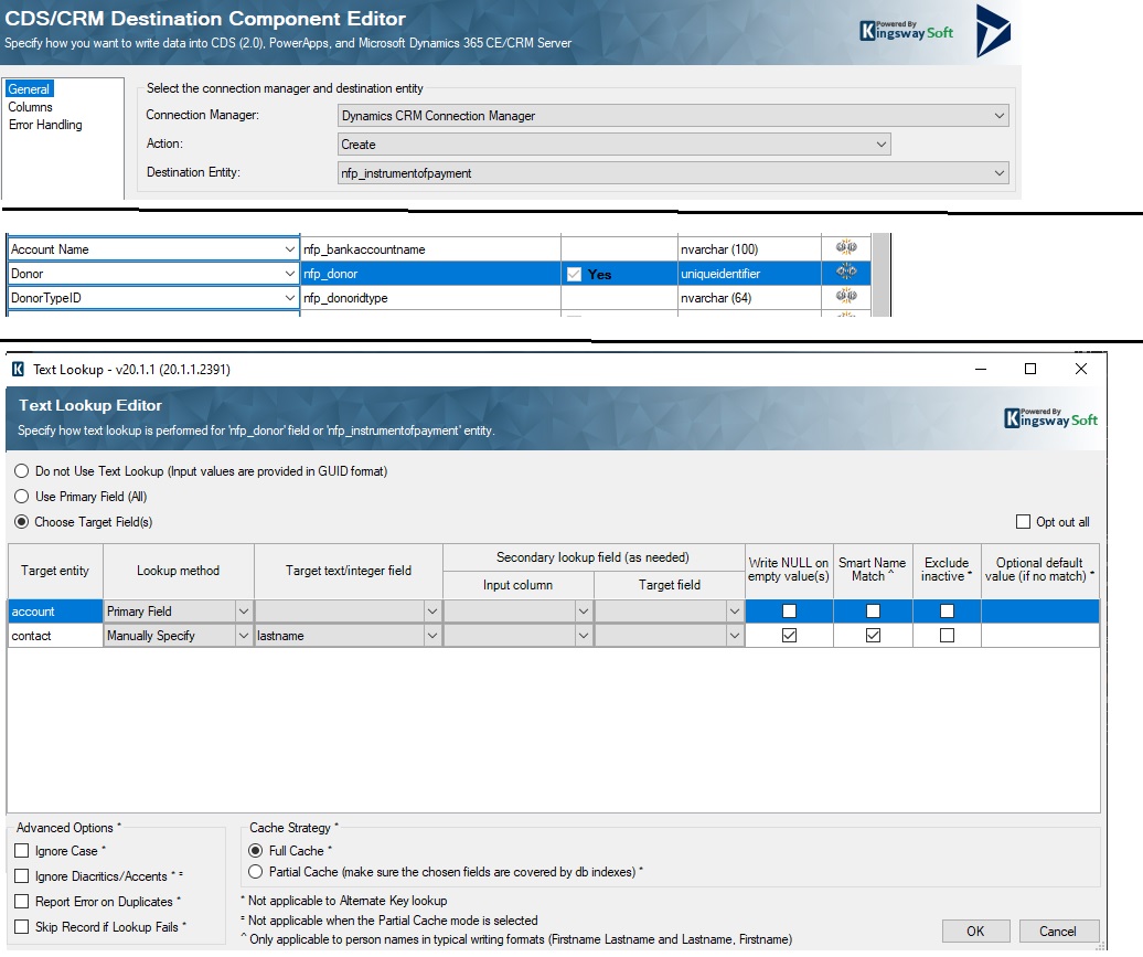 我试图使用nfp_InstrumentOfPayment实体的Kingswaysoft工具将数据插入Dynamic365号中,其中一个字段是nfp_donor,它是客户数据类型的。我的输入CSV文件包含字段DonorTypeID和捐献者,值'XXX XXXXXX',以及到nfp_donor和nfp_donoridtype的“contact”映射。