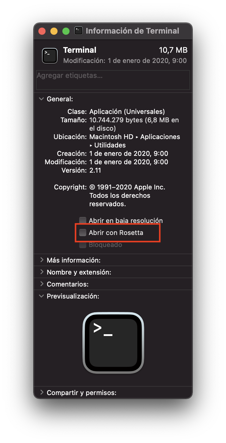 选项2:有一种选择,使用Rosetta打开您的终端。我还没有试过,但是应该给出相同的结果而不用前缀。