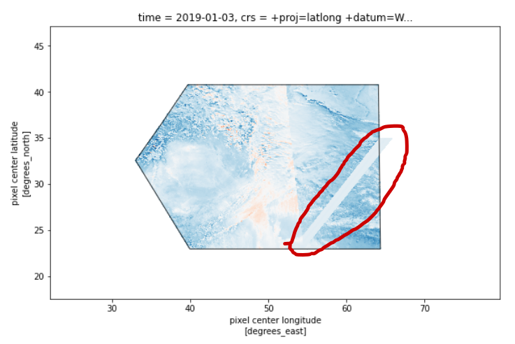 基于@dl.meteo的建议,我使用了satpy库来解决我的问题,它似乎可以合并两个netcdf文件,但并不完全,您可以在联接图像中看到一个不正确的部分(红色边界)。satpy能正确地做到这一点吗?