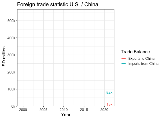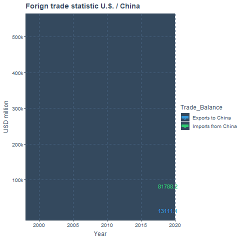 labs(x="Year", y="USD million",title="Foreign trade statistic U.S. / China",