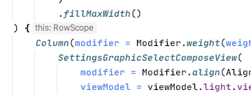 我有一个Column组件(SettingsGraphicSelectComposeView.kt),它的权重需要1f (modifier.weight(weight = 1f)),这样这个组件在容器中的倍数就会均匀分布。问题是,当从alpha02升级到alpha06时,不再有可能将上述修饰符分配给列。