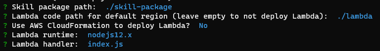 我想使用我以前在web中创建的现有技能。所以我创建了两个文件夹:lambda和skill-package。然后我使用了ask init,说我不想使用AWS CloudFormation来部署: