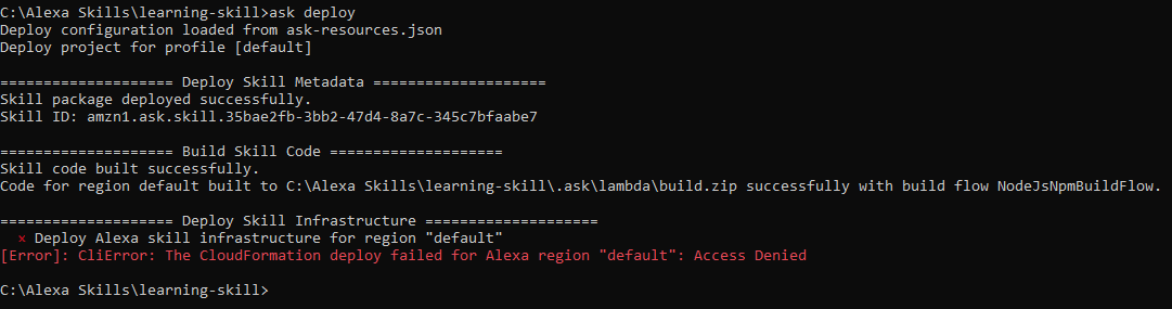 尝试使用ask deploy部署技能,获取[Error]: CliError: The CloudFormation deploy failed for Alexa region "default": Access Denied。